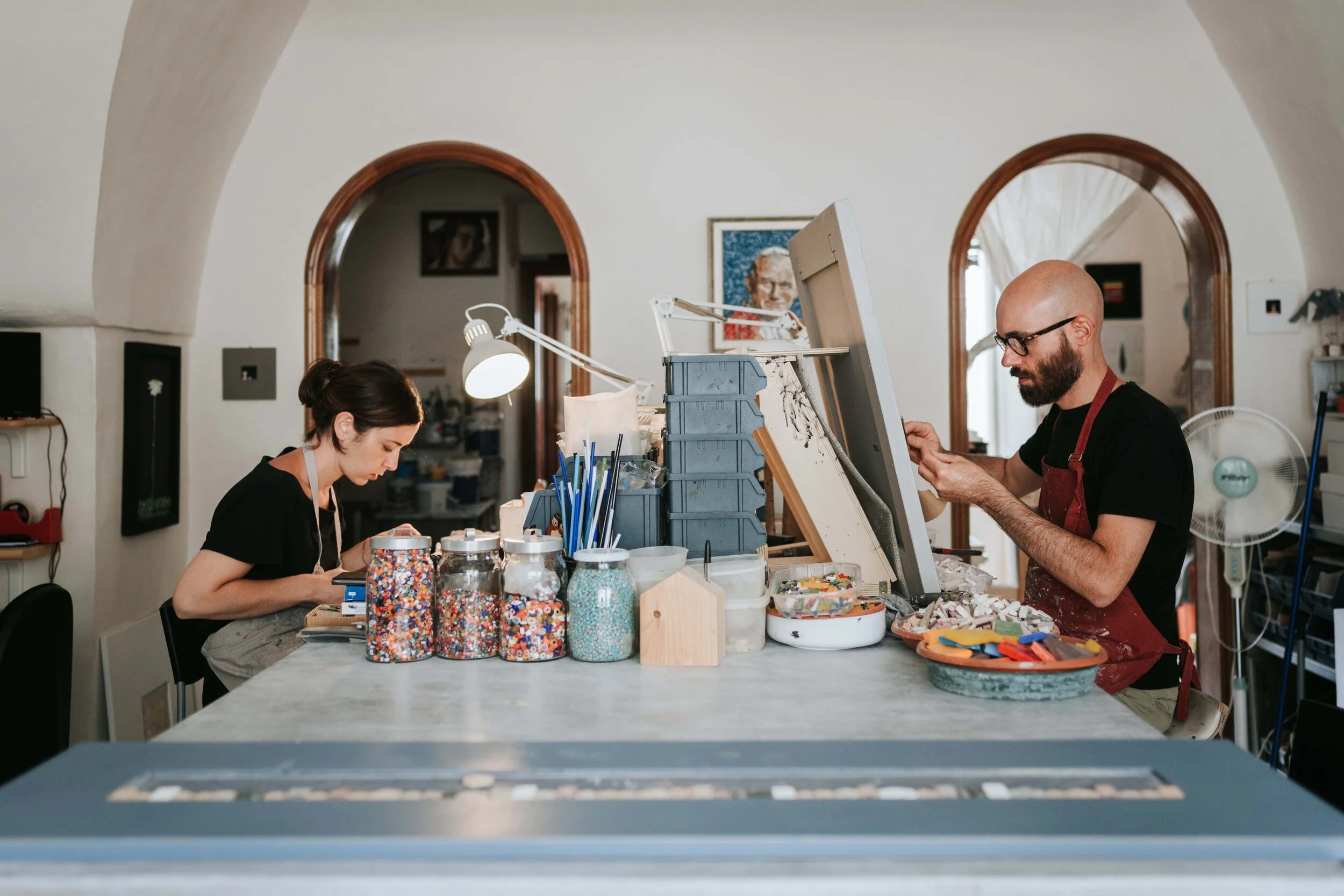 Un atelier artisanal au cœur du Salento, parmi les oliviers, les maisons peintes à la chaux et l'air marin frais. Voici le lieu où Francesca et Matteo réalisent des mosaïques créatives, toutes faites à la main avec du marbre, du verre, de l’or ou des murrine.